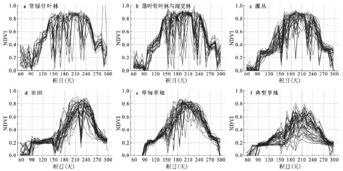 按照制图点选取原则,研究选取234个制图点,其分布如图1所示。包括常绿针叶林点26个,落叶针叶林与混交林点36个,灌丛点41个,农田点46个,草甸草地点37个,典型草地点48个。基于MODIS数据得到的6种采样点NDVI曲线如图4所示。值得一提的是,研究着重于在NDVI曲线中判断植被分类特征,为避免精度损失与误差增加,未对所有NDVI曲线进行拟合与平滑。同时,环境减灾卫星NDVI曲线与MODIS NDVI曲线对比结果如图5所示。