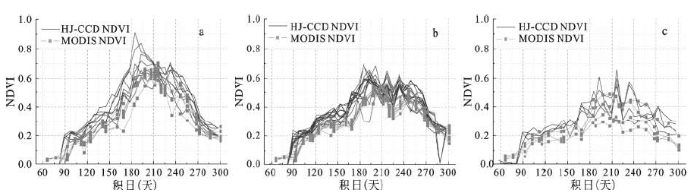图5 草地样点的环境减灾卫星CCD和MODIS NDVI曲线结果对比a 草甸草地; b 典型草地; c 荒漠草地