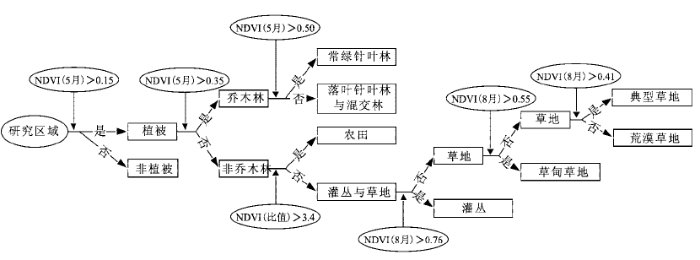 基于以上分析结果,采用1 a内5月上旬与8月上旬的两期环境减灾卫星CCD数据的NDVI开展植被覆被分类研究。7种植被类型在两期产品上取值区间如表3所示。根据表3的结论,采用决策树分类方法与环境减灾卫星CCD数据提取呼伦贝尔地区植被分类信息,决策树如图6所示。