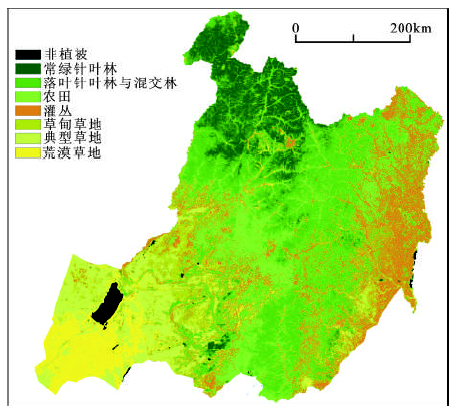 常绿针叶林 | 落叶针叶林与混交林 | 灌丛 | 农田 | 草甸草地 | 典型草地 | 荒漠草地 | |