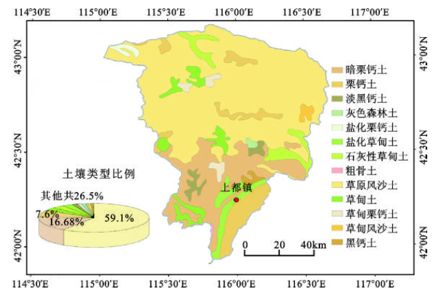 土壤类型数据:土壤类型不同,其颜色、质地、结构等众多物理化学性状也会发生相应变化,并可以被卫星遥感影像所反映。根据全国第二次土壤普查获得的全国1:100万土壤类型图,正蓝旗地区主要土壤类型包括风沙土、暗栗钙土、盐化栗钙土等(图1)。总体上看,草原风沙土和暗栗钙土分别是正蓝旗北部和南部地区的主体土壤类型;其它类型土壤所占面积不大,且分布零散。结合正蓝旗地形、地貌以及植被群落空间分布信息,正蓝旗南部为低山丘陵,属草甸草原;北部系浑善达克沙地,属荒漠草原类型。