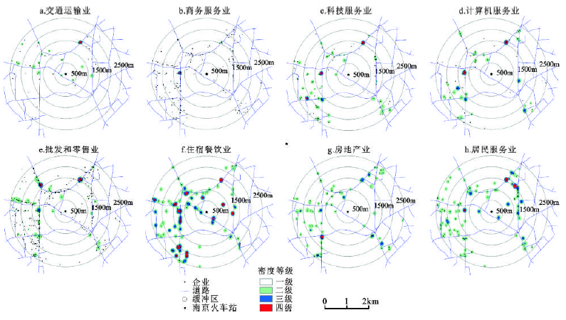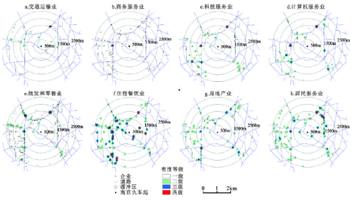 1) 通过分析高铁乘客出行目的地、交通方式选择以及出行距离等内容,初步确定了南京站区的圈层范围是0~3 000 m。以南京站为中心,500 m、1 000 m、1 500 m、2 000 m、2 500 m的缓冲区分析,南京站区各行业的企业分布呈现“圈层”拓展特征。集聚高点在2 000 m处,2 500 m处企业数量明显降低,3 000 m处企业数量明显增高,由此确定高铁站区的范围是0~2 500 m。5个圈层横向比较发现,批发和零售业的企业数量最多,商务服务业次之,科技服务业位居第三。