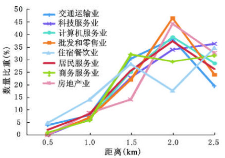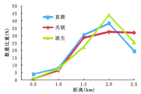 在分行业研究的基础上,根据高铁乘客的商务特性等,将各行业按照与高铁关系的远近,划分成直接、关联和派生三大类(图3)。统计每个圈层内各大类行业的企业数量绘制成图4。可以看出,三类企业在2 000 m圈层比重达到最高,随后降低。进一步的分析可以看出,在0~1 500 m圈层内,直接相关性企业比重最高,关联性企业比重次之,派生企业比重最低;而在2 000 m圈层左右,派生企业比重跃至最高。这一结论反应了直接相关企业、关联企业以及派生企业的交通指向性由强到弱,符合预期。