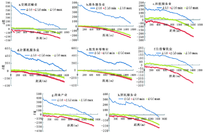 Ripley’s K函数结果显示各行业的集聚程度均高于随机分布的最大值(图5),显著性全部通过检验,即表明这些观测企业在所有的观测距离尺度上均是显著集聚的,这也进一步证实了企业在空间上集聚是一个普遍的地理现象[24]。交通运输业、商务服务业、批发和零售业的L值始终位于L_Max曲线的上方,且大于零,表明这三类行业是显著集聚的,并随着距离的增大集聚效果降低。其中,交通运输业随距离增大集聚程度降低最明显,表明高铁站区交通运输业集中分布现象更为明显。住宿餐饮业、房地产业、计算机服务业、科技服务业以及居民服务业这五类行业的L值始终位于L_Max曲线的上方,且在绝大多数距离范围内始终大于零,表明这五类企业在绝大多数距离范围是显著集聚的,但也有小于零的情况,表明这五类企业,在超出这些范围是分散的。其中,住宿餐饮业、计算机服务业、科技服务业以及居民服务业与置信区间下降趋势相比较均匀,说明这几类行业在高铁站区集聚分布的基础上均匀分布。房地产业随距离增大集聚程度显著降低,表明高铁站区房地产业集中分布的现象更为明显。