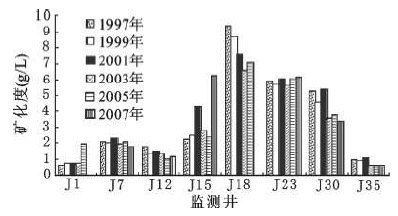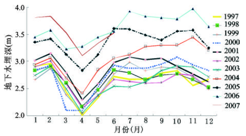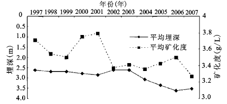 地下水矿化度的年均变化,1997~1999年期间有所下降,2000年明显上升,2001年相对于2000年变化不大,2001~2002年明显降低,2002~2007年之间有上下浮动不大,其中2006年有所升高。总体上看,矿化度年均变化不明显,从1997年3.71到2007年3.27,浮动很小,2001年变化稍大。地下水矿化度和埋深情况在变化趋势上基本一致(图4)。