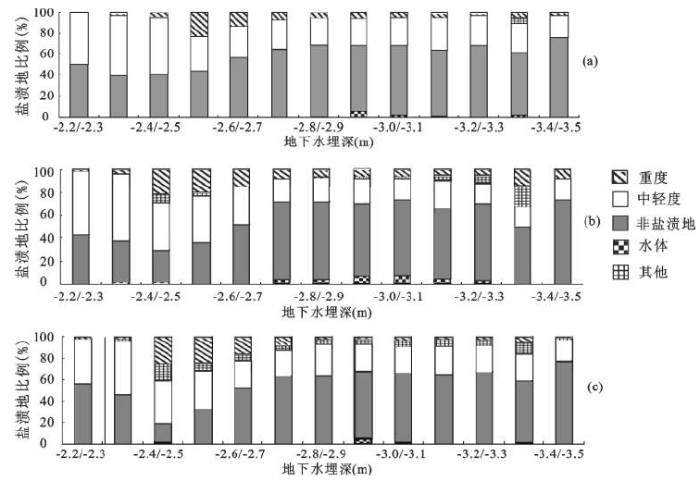 2001年,在地下水埋深2.3~2.7 m区间,盐渍地面积(含中轻度和重度盐渍地)都约占50%以上,其中以2.4~2.5 m区间最高,约占70%;在地下水埋深2.7~3.4 m区间,盐渍地面积占30%以下,此区间多以非盐渍地居多,仅在地下水埋深3.3~3.4 m区间非盐渍地较少,此处主要原因是靠近山区,其他类型占具一定比例(图3b)。