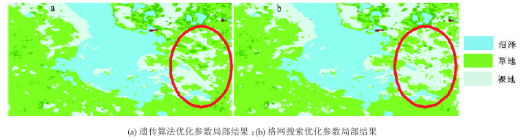 对比表2和表3可知,遗传算法优化的支持向量机湿地遥感分类与格网搜索下的支持向量机湿地遥感分类相比,在不同地物上分别有不同程度的精度提高,特别是在耕地、沼泽、裸地和草地,生产者精度与用户精度提高10%左右,改进了不同地物的区分,沼泽、裸地与草地三者光谱相似,群落相互之间没有严格的界限,遗传算法优化方式依然能做出准确地区分。