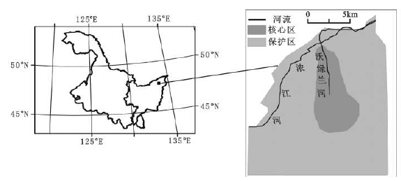 洪河自然保护区位于黑龙江省三江平原东北部的同江市与抚远县交界处, 133°34′28″E~ 133° 46′29″E, 47°42′18″N~ 47°52′18″N。总面积为21 835.7 hm2(图1)。