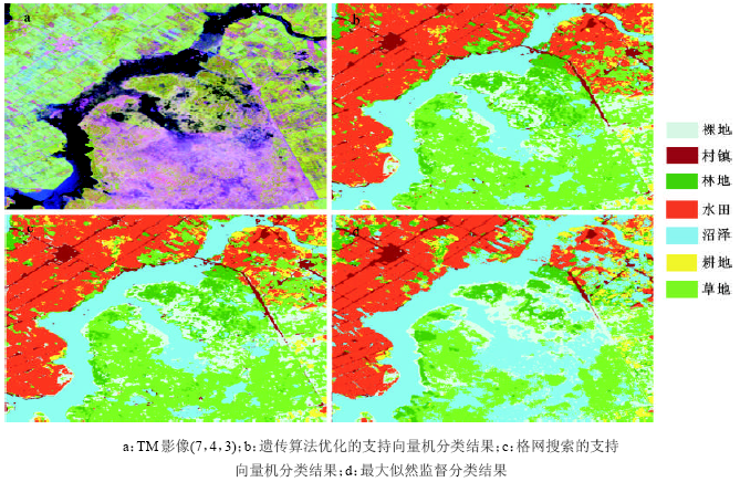 使用ENVI4.7遥感软件下的支持向量机分类器,采用径向基核函数作为分类核函数的类型,分别采用两种方式所确定的最优参数训练分类器对整幅影像进行分类,同时采用传统的最大似然监督分类方法做分类对比,分类结果比较如图2中的b、c、d所示