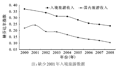 2000~2008年长三角都市圈入境旅游赫芬达尔指数介于0.24和0.37之间(图1 ),其入境旅游收入集中程度较高。但入境旅游收入的集中程度在不断下降,表现为其旅游赫芬达尔指数呈减小趋势。长三角都市圈国内旅游赫芬达尔指数也呈减小趋势,且远低于入境旅游赫芬达尔指数,说明其国内旅游收入空间分布趋向均衡,同样反映出国内旅游对长三角都市圈旅游空间均衡发展贡献更明显。旅游收入在上海、南京、杭州和苏州等城市集中程度的下降,反映了长三角都市圈旅游收入空间分布趋向均衡,旅游空间结构演变趋向均衡化。