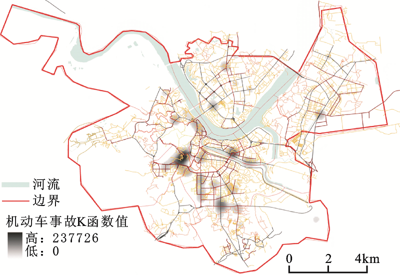 本文采用核心密度估算(Kernel Density Estimation)对交通事故进行分析,该方法的优势在于便于研究事故危险的扩散性,即某一确定事故群的周围可看做事故的潜在发生地。核心密度估算可以在二维的地理空间内生成空间点事件的光滑密度表面,其一般形式是: