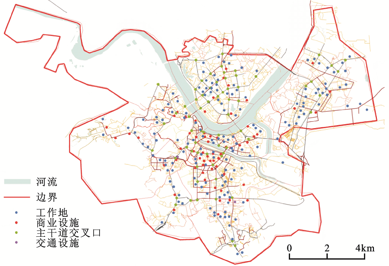 为了方便对交通事故空间位置的描述和分析,本研究选取若干类与交通事故有关的设施点,包括商业设施、主干道交叉口、工作地和交通设施4类。商业设施由惠州市土地利用现状图C2类商业用地的几何中心确定,结合google地图和实地调研进行校核;主干道交叉口为公路与公路、公路与主干道、主干道与主干道的交点,主干道与次干道和支路的交点不计在内;工作地由惠州市土地利用现状图除C2以外的C类公共设施用地和M类工业用地的几何中心确定,同样经过实地校核;交通设施指客运站,在惠州仅有两处。以上共提取商业设施点62个、工作地点157、主干道交叉口67个、交通设施点2个,共计288个设施点(如图2)。
