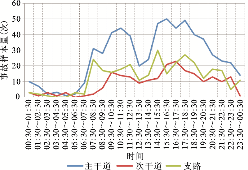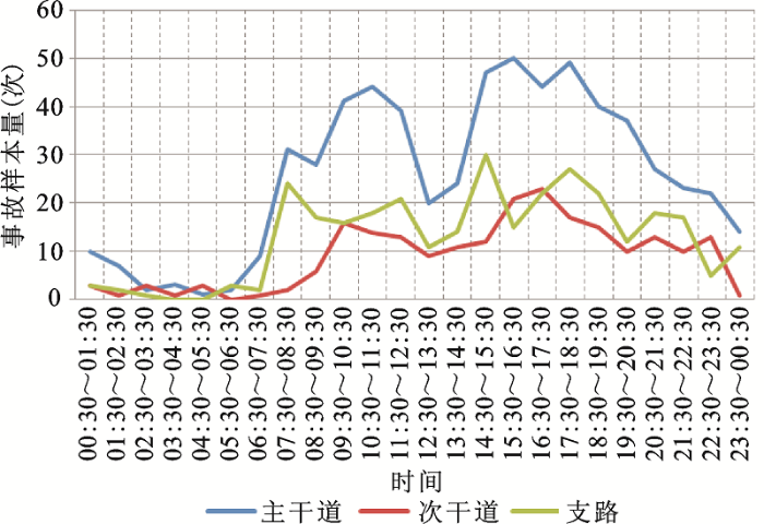 将惠州市中心城区城市道路分为主干道(包括公路和城市主干道)、次干道和支路,选择距事故距离最近的路段并确定所在道路等级,分别统计各等级道路的事故量,并显示其时间变化(如图6)。从变化趋势看,主干道事故在交通消散期出现事故高峰现象明显,且出现在早上和下午;次干道事故最高值出现在下午消散期中的16:30~17:30,次高值为15:30~16:30,而上午的事故最高值为9:30~10:30,是典型的早交通消散期事故高峰;支路交通事故的波动性较大,早交通流量高峰和晚交通流量高峰都出现支路事故高峰,但最高值出现在下午的14:30~15:30,同时注意到支路上的交通事故出现了晚交通消散期高峰现象,即20:30~22:30间的交通事故量多于晚交通高峰期的事故量。