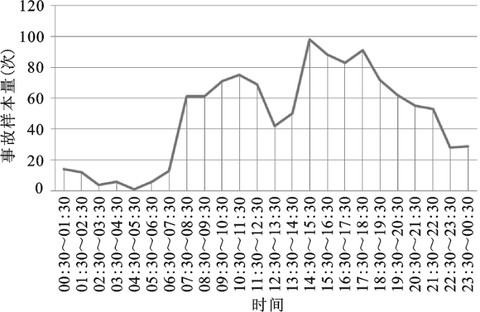 图3显示了惠州市中心城区交通事故量随时间呈双峰的特征,即10:30~11:30为上午的事故高峰,14:30~15:30为下午的事故高峰,12:30~13:30为中午的事故低谷。从实地调研中了解到,惠州市中心城区交通高峰时段为早上班高峰(7:30~9:30)、晚下班高峰(17:30~19:30)和中午的上下班次高峰(11:30~12:30,13:30~14:30);与此相对的交通消散期包括上午(9:30~11:30)、中午(12:30~13:30)、下午(14:30~16:30)和晚上(18:30~23:30)。