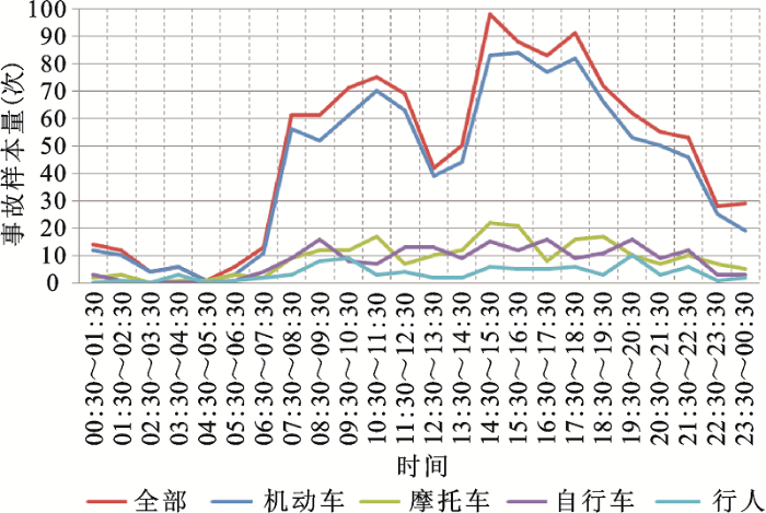2) 交通事故的结构性特征:机动车在交通事故中占据绝对的主导地位;商业设施相关事故的交通消散期事故高峰现象最为明显,主干道交叉口相关事故的交通消散期事故高峰现象最不明显;支路事故在晚间交通消散期后段出现了事故高峰。