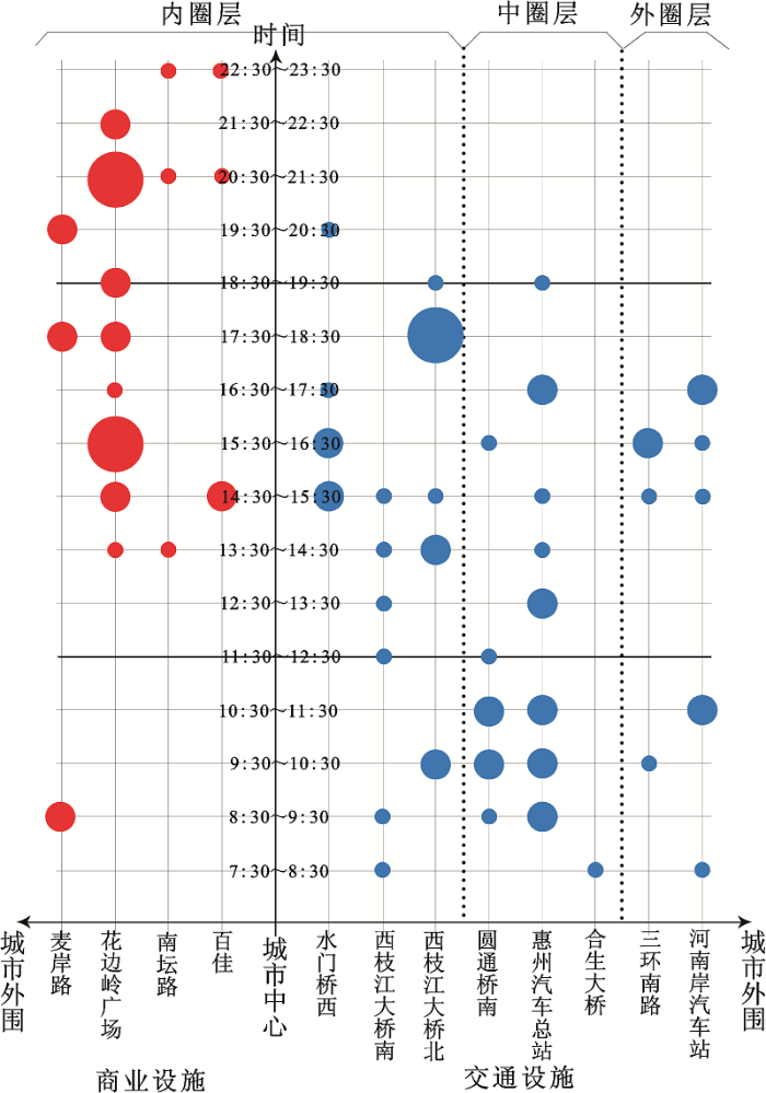 为使惠州市惠城区交通事故的时空分布特征更为清晰直观,基于24张所有时间段的设施点密度分布图,将全天的交通事故的空间分布进行抽象性简化,形成交通事故时空分布示意图(图7)。以距离为横轴、时间为纵轴构造坐标系,横轴的正方向分布与交通有关的设施(主干道交叉口和交通设施),横轴的负方向分布商业设施;横轴上设施点按距离依次排列在横轴上,并分为内圈层、中圈层和外圈层;最后将每个时间段内各个设施点的密度在坐标系中显示。
