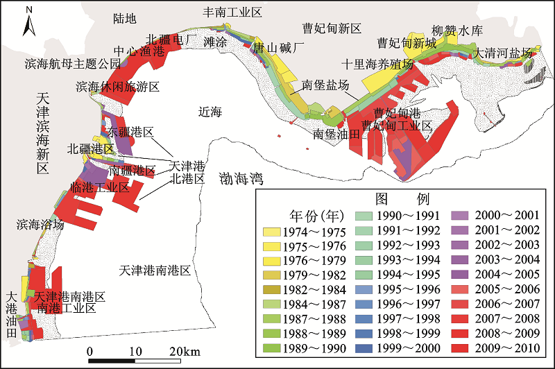 渤海湾西北岸1974~2010年逐年填海造陆进程分析 |