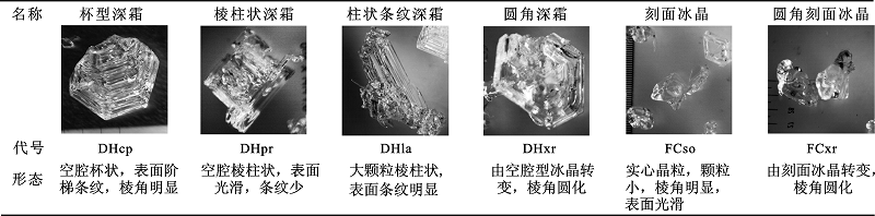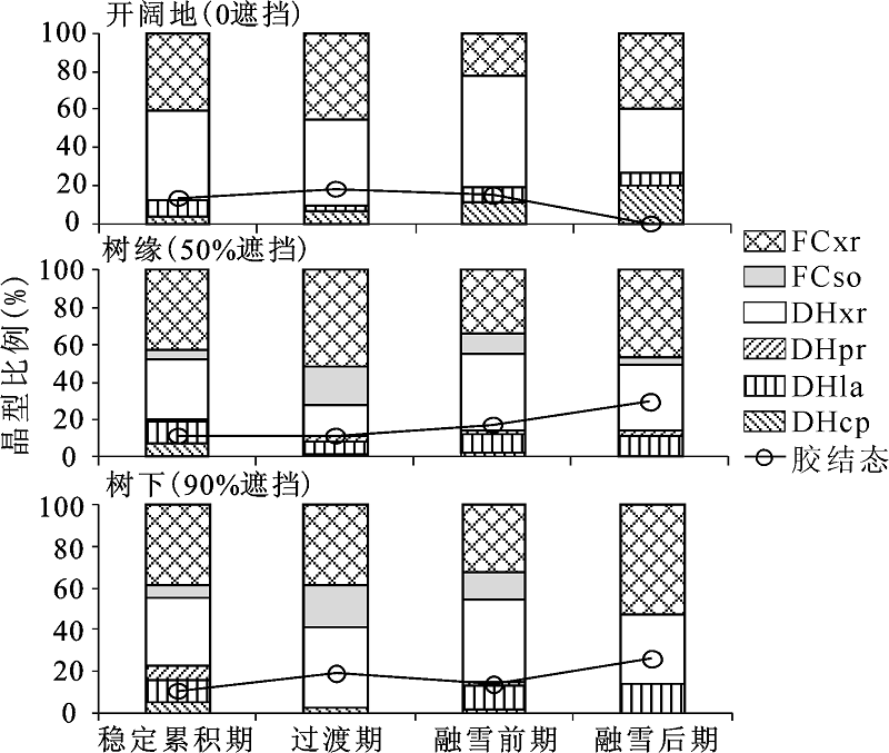 在西北季节性积雪区深霜内主要发育杯型深霜(DHcp)、棱柱状深霜(DHpr)、柱状条纹深霜(DHla)、圆角深霜(DHxr)、刻面冰晶(FCso)和圆角刻面冰晶(FCxr)(图6 )。观测期内DHxr和FCxr最多,开阔地、树缘和树下深霜中两种晶型共占86%、75%和74%。这两种晶型均发育于减小的温度梯度环境中,因而与雪深有很好对应。在水汽充裕环境下冰晶间易粘连成胶结态,其比例占10%~30%。