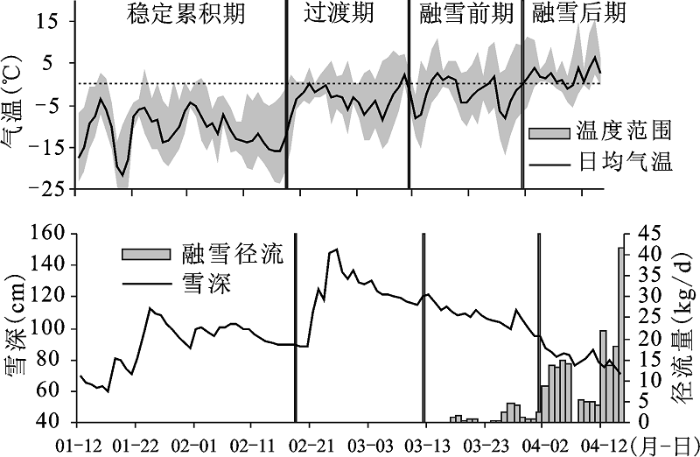 选择2010年1月12日~4月15日为观测期,根据积雪站的气温、积雪深度和融雪资料(图1 ),将试验期划分为4个时段:积雪稳定累积期(2月18日前)日均气温保持0 ℃以下,雪深稳步累积增大;过渡期(2月19日~3月12日)气温逐渐上升,但仍低于0 ℃,雪深开始缓慢减小;融雪前期(3月13日~4月1日)气温在0℃波动,雪深继续减小,开始出现持续的融雪径流;融雪后期(4月2日后)日均气温开始大于0℃并逐步上升、融雪径流量明显增大。