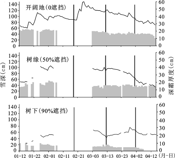 2) 季节性积雪区深霜发育厚度与雪深呈正相关关系,有开阔地(0遮挡)>树缘(50%遮挡)>树下(90 %遮挡),融雪期深霜厚度消减速率有树下>开阔地>树缘。