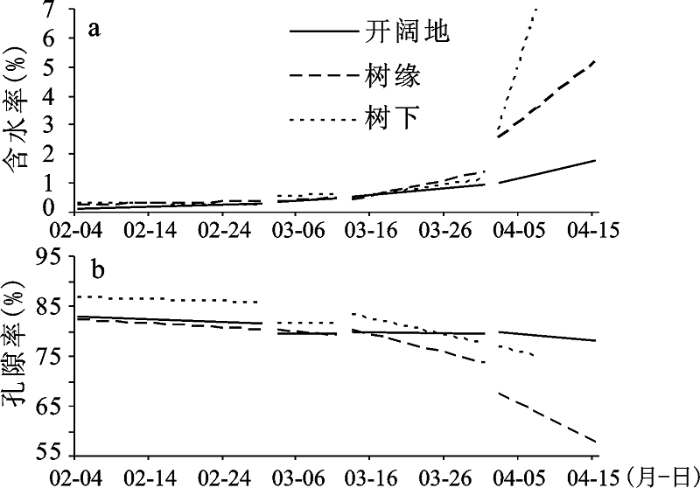 融雪开始后,深霜层温度梯度迅速减小至0℃/cm (图3 b),雪融水的进入明显增加了含水率,为冰晶增长提供了充沛的水汽源。这一时期冰晶开始进入棱角圆化、粒径迅速增长的湿雪变质阶段。融雪前期开阔地、树缘和树下深霜的含水率无太大差异,因而继续保持过渡期的粒径排序,其平均粒径为2.58 mm、1.66 mm和1.60 mm。同时树缘和树下深霜孔隙率迅速减小(图5 b),抑制冰晶增长,所以二者的粒径增速小于开阔地。至融雪后期,孔隙率持续减小,冰晶开始变小或勉强维持原状,但开阔地的粒径仍大于树缘和树下。