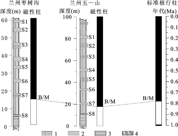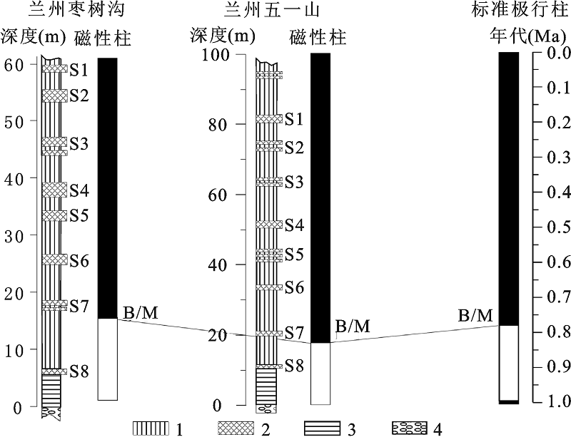 河流阶地的采样点位于兰州盆地的枣树沟阶地和五一山阶地,这两级阶地为典型的基座型阶地。枣树沟阶地拔河80 m,砾石层厚约4 m,河漫滩相粉砂层厚约6.5 m,其上是约64 m厚的风成黄土堆积,野外鉴定出风成黄土部分含有八层古土壤,拟定为古土壤序列S1~S8,且最底部发育了古土壤S8。五一山阶地拔河140 m,砾石层厚约5 m,河漫滩相粉砂层厚约10.5 m,其上是约100 m厚的风成黄土堆积,野外鉴定出风成黄土部分含有九层古土壤,拟定为古土壤序列Sm~S8,且底部发育了古土壤S8。