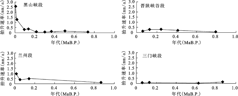 根据上述运用河流下切速率近似估算地面抬升速率的方法,得出黄土高原地区兰州段、黑山峡段、晋陕峡谷段、三门峡段0.8 Ma以来的地面抬升速率(图3)。