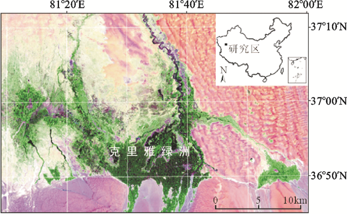 克里雅绿洲位于昆仑山中段的北麓,塔克拉玛干沙漠南缘克里雅河流域,是一个典型的绿洲—荒漠交错地区(图1)。地处东经81°08′59˝~82°00′03˝E,北纬36°44′59˝~37°12′04˝N,总面积为376 498 hm2。该区南高北低,最高海拔5 460 m,最低海拔1 180 m,在气候上属暖温带大陆性干旱气候,热量与光照丰富,多年平均气温12.4℃,≥10℃积温为4 340℃,多年平均降水量为44.7 mm,多年平均蒸发能力为2 498 mm,无霜期为200 d[17]。克里雅绿洲有大小河流11条,其中可利用的河流5条,年总径流量9.61×108m3。天然植被以芦苇(Phragmites communis)、柽柳(Tamarix spp.)、胡杨(Populus euphratica)、骆驼刺(Alhagi sparisifolia)为主。克里雅河源于昆仑山北麓,流经克里雅绿洲消失在塔克拉玛干沙漠腹地。