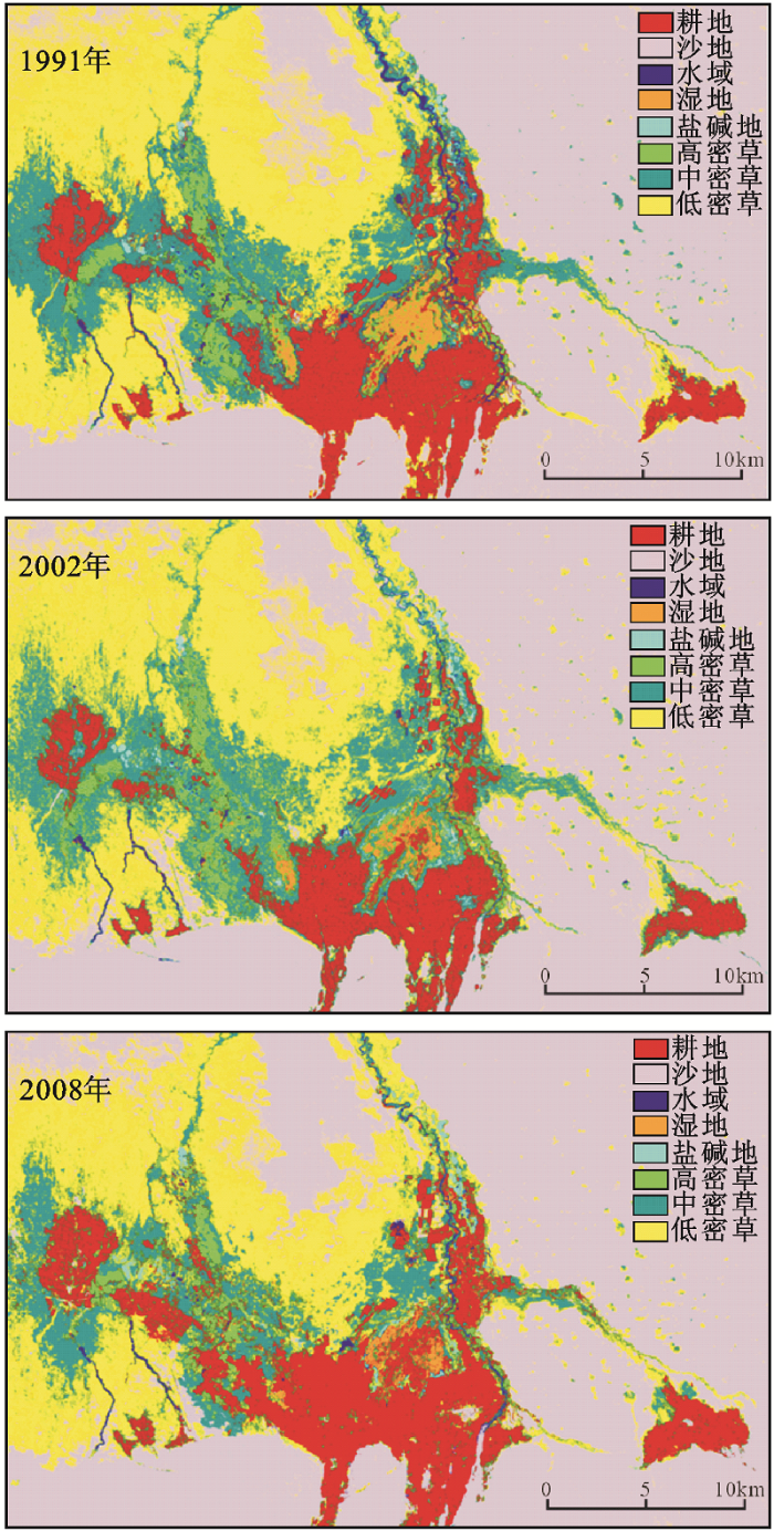 研究采用的土地利用动态数据的获取以克里雅绿洲1991年、2002年9月Landsat影像以及2008年9月Alos影像作为基本信息源。首先,利用克里雅绿洲1∶10 000地形图对2008年的遥感图像进行几何校正,接着以2008年的图像为基准,校正1991和2002年的图像,使该三景影像具有同样的地图投影方式,RMS校正误差均在0.5个像元以内。根据研究区的特点,将研究区土地利用类型划分水域(包括湖泊、水库、河流、渠道、滩地)、湿地(经常积水或渍水,生长湿生植物的土地)、沙地、盐碱地、高密草(植被盖度大于50%的草地)、中密草(植被盖度大于20%,小于50%的草地)、低密草(植被盖度大于5%,小于20%的草地)和耕地等8类。在ArcGIS 8.0支持下按照土地利用分类系统建立解译标志,通过进行监督分类和目视解译相结合,获取了研究区1991、2002和2008年土地利用变化图与相关数据(图2)。应用野外调查采样点的数据与研究区地形图和土壤图,在ENVI 4.3软件下对遥感影像分类结果进行精度检验后得知3个时期的总精确度和Kappa指数等均大于0.83,其分类结果符合精度要求[18]。
