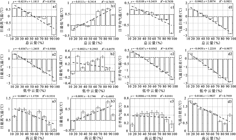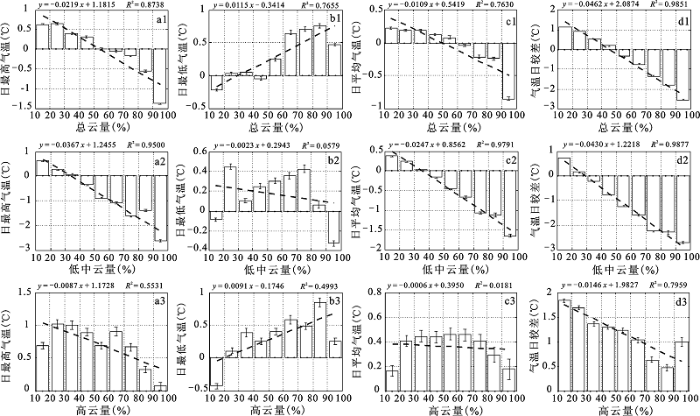 图2 日气温随云量变化的平均值、标准误和线性拟合结果(虚线表示线性拟合关系)