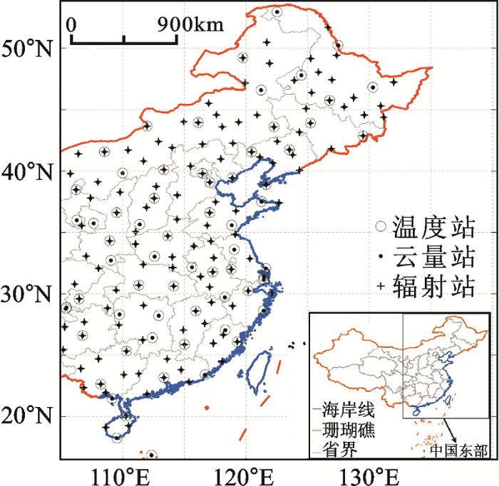 本文中,将中国东部定义为105°E以东的中国地区;夏季定义为每年6~8月[10~13];无雨日定义为降水量为0;晴空定义为降水量为0且总云量<1成;相关分析采用Pearson相关系数[13,14];回归分析采用一元线性回归。