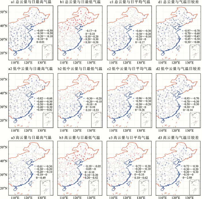 需要指出的是:① 与日最高气温进行相关分析和回归分析时,采用白天云量;与日最低气温进行分析时,采用夜间云量;同理,与日平均气温、气温日较差进行分析时,采用每日平均云量。② 本文中的高云量是由总云量减去低中云量得到的。由于低中云的存在会对高云产生遮蔽,因此,为保证求出的高云量具有较高的可信度,我们在分析高云量与温度、日较差及辐射的关系时,仅讨论天空中只存在高云的情况,即低中云量<1成的情况。
