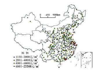 根据2009年中国各城市房价排列规律,参考聚类分析结果可知:住宅均价在2001~4000 元/m2的城市达179个,数量最多,因此将其定义为中等房价城市;低于2 000元/m2为低房价城市,共43个;高于4 000 元/m2为高房价城市,共64个。其中,大于6 000 元/m2的有22个城市,定为极高房价城市(表1)。北京、上海、广州、深圳4个“一线城市”和杭州、温州、三亚3个沿海城市的房价大于10 000 元/m2,是中国房价最高的7个城市。