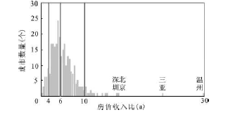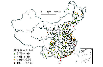 由图2、图3可知,中国高房价收入比的城市数量多,低房价收入比的城市数量少。2009年末,已有145个城市的房价收入比大于6 a,占城市总数的50.69%,这表明中国购房较为困难的城市已超过半数。其中,有17个城市的房价收入比大于10 a。温州(29.92 a)、三亚(22.92 a)、北京(15.76 a)和深圳(15.40 a)是购房困难程度最大的4个城市;杭州、上海、丽水、福州、大连、广州、宁波、海口、厦门、廊坊、湛江、台州、珠海也是房价收入比极高的城市。这些城市除北京和廊坊外,都是沿海城市。高房价收入比(6.01~10.00 a)的城市多达128个,在沿海地区和内陆地区均有分布,主要集中在广东、福建、浙江、江苏、河北、安徽、湖北、四川、黑龙江等省份。因此,虽然中国住宅均价高的城市主要分布在沿海,且数量不多,但房价收入比高的城市从沿海到内陆分布广泛,数量很多。中水平房价收入比的城市共119个,占总数的41.61%,主要分布在内陆地区。低房价收入比的城市数量很少,仅22个,主要分布在西部地区和东北地区。中国中低房价水平城市的数量远大于中低房价收入比城市的数量。