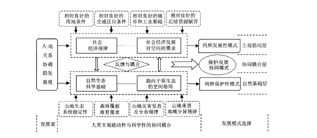 ... 山地资源型城市地域空间发展同时受自然生态规律和社会经济规律制约和支配,其实现应基于空间开发适宜性评估.地域空间开发适宜性格局是山地资源型城市地域空间可持续发展的自然生态基础.从尊重自然生态规律出发,强调山地资源型城市的地域空间开发适宜性格局蕴含着基于自然生态属性的空间秩序性.随着社会经济发展、科技进步及人类自身需要,山地资源型城市除了走基于自然属性的“保护性”模式外,还必然要求偏重社会经济属性的“发展性”模式.这既是尊重资源型地区追求发展的正当意愿,也是顺应“空间均衡”的发展理念.地域空间可持续发展模式必须在人- 地关系协调观念指导下,深入分析资源环境本底和生态环境状况,结合社会经济条件,根据所处空间尺度认真研究,提出符合地域特点的空间开发模式(图4 ).过分考虑发展性模式,通常缺乏自然生态科学基础;过度强调“纯自然”的保护性模式,则极易陷入生态中心主义的绝对“荒野保护”[11 ] ,这两种极端都不可取. ...
