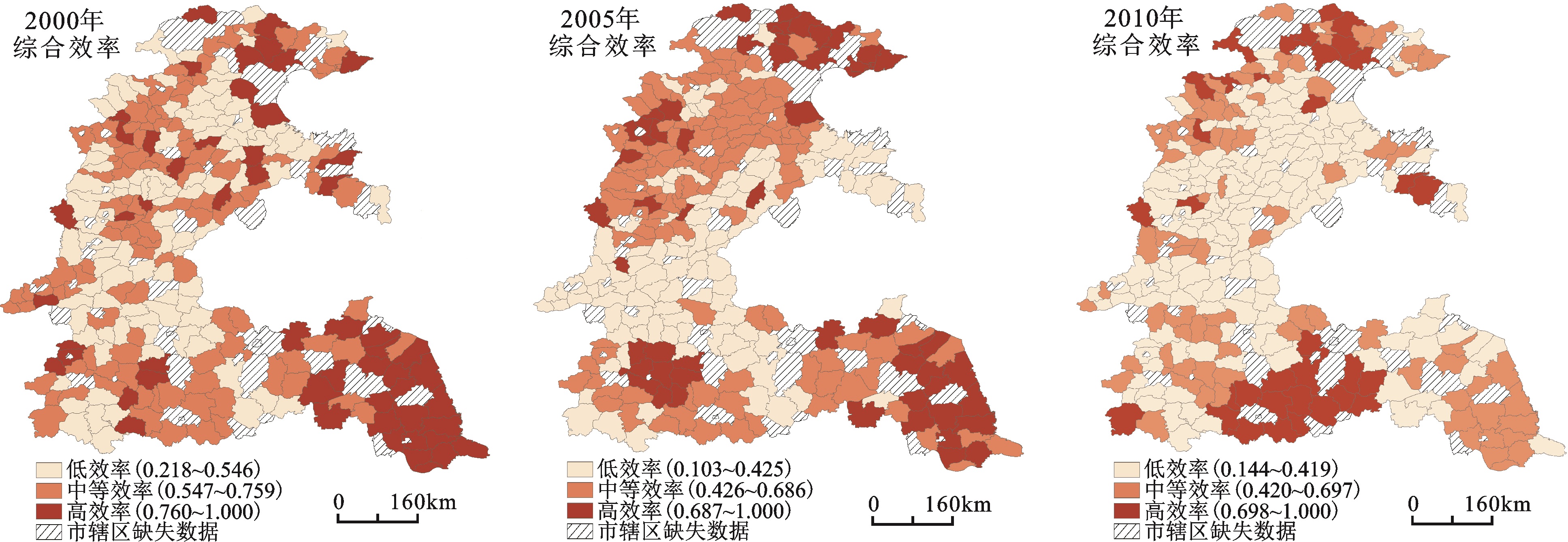 Fig.3 Spatial distribution of agricultural average efficiency in the Huang-Huai-Hai Plain (in 2000, 2005 and 2010)