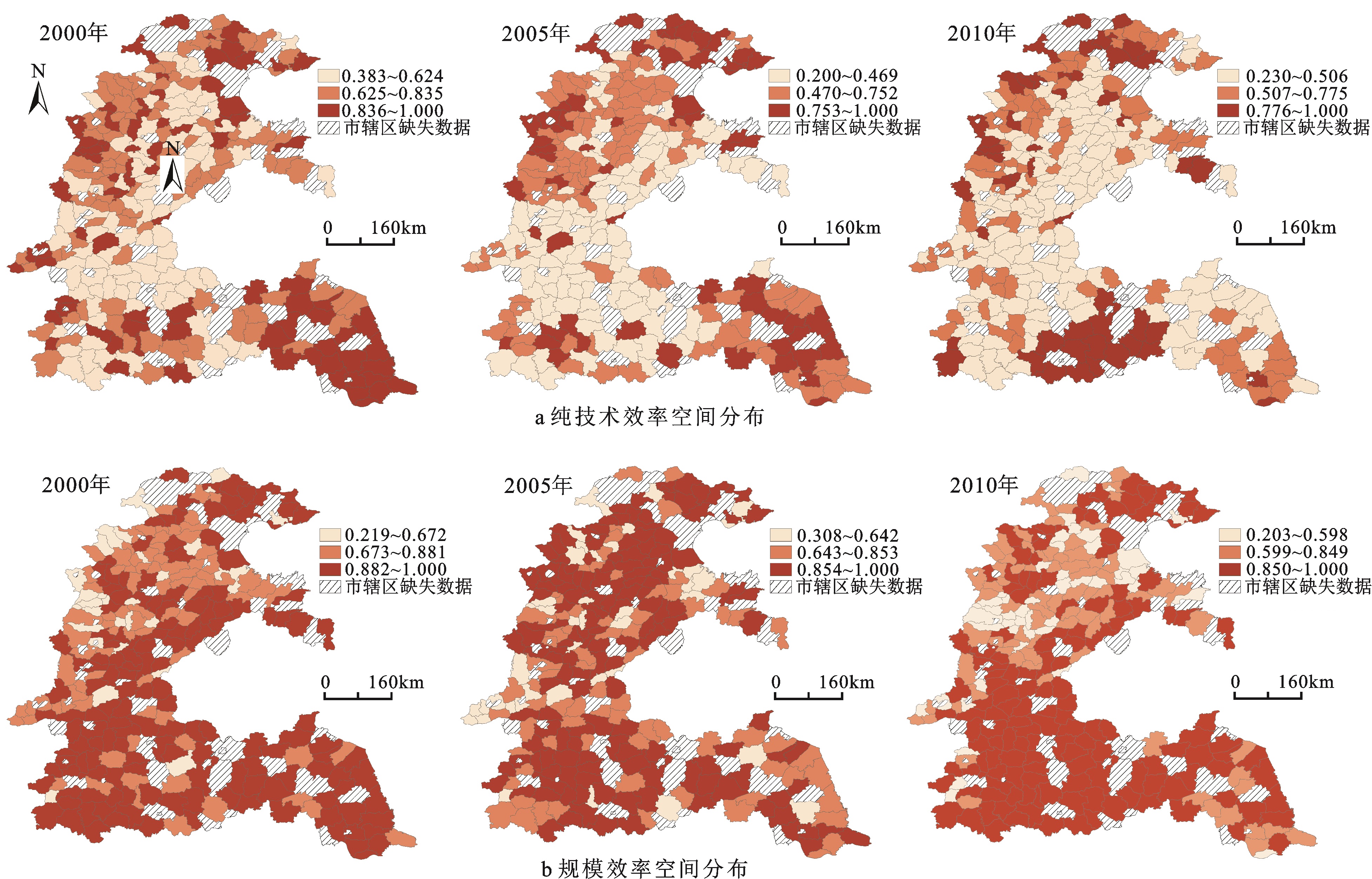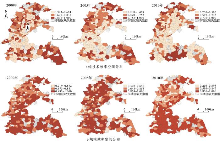 图4 黄淮海平原农业技术效率(a)和规模效率(b)空间分布(2000年、2005年和2010年)