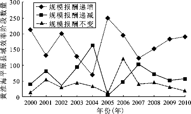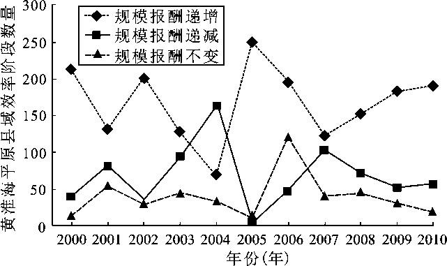 根据DEA规模收益分析,可以判断各县域农业生产规模收益的阶段。当规模收益非增条件下的效率大于规模不变条件下的效率时,农业生产处于规模收益递增阶段,表明要是投入尚未达到最佳规模,通过进一步增加要素投入,可得到更高的收益,从而实现农业效率的进一步增长;如果规模收益非增条件下的效率大于规模收益不变条件下的效率,在农业生产效率处于规模收益递减阶段,表明要素投入规模已经超过农业发展对要素的吸收能力,需要减少要素的投入,从而获得农业效率的提高。计算结果表明,2000年、2005年和2010年规模递增县域分别为210个、188个、195个;2000年、2005年和2010年规模递减的县域分别为45个、67个、57个;2000年、2005年和2010年规模不变的县域分别为13个、13个、16个。总的来看,黄淮海平原目前大多数县域单元处于规模报酬递增阶段(图6),这说明黄淮海平原目前的农业生产规模普遍没有达到最佳生产前沿面,因此,仍然可以通过扩大规模获得更高的收益。
