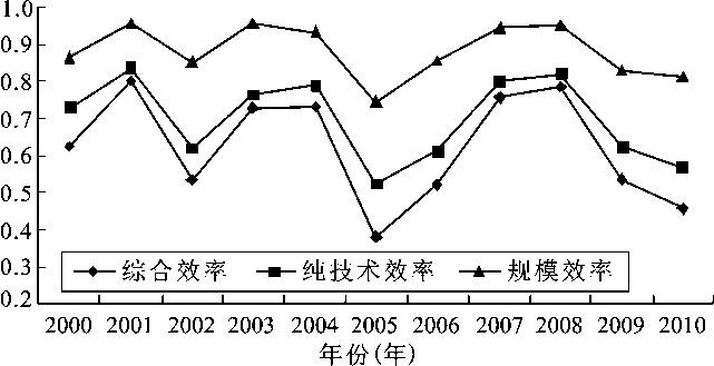 图1 黄淮海平原2000~2010年农业综合效率、 纯技术效率、规模效率变化