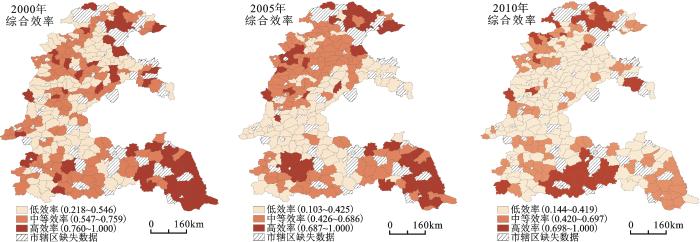 图3 黄淮海平原农业综合效率空间分异(2000年、2005年和2010年)