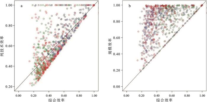 2) 多数县域规模效率达到有效状态,且规模效率大于纯技术效率。相较于纯技术效率(PTE),更多的县域单元农业规模效率达到或接近最佳状态,农业规模效率和综合效率位于散点图的顶端和偏上部,使这些散点偏离45°对角线的程度较纯技术效率的偏离更多(图5b)。