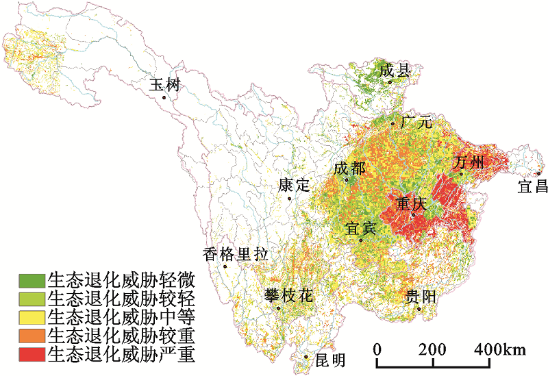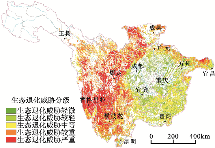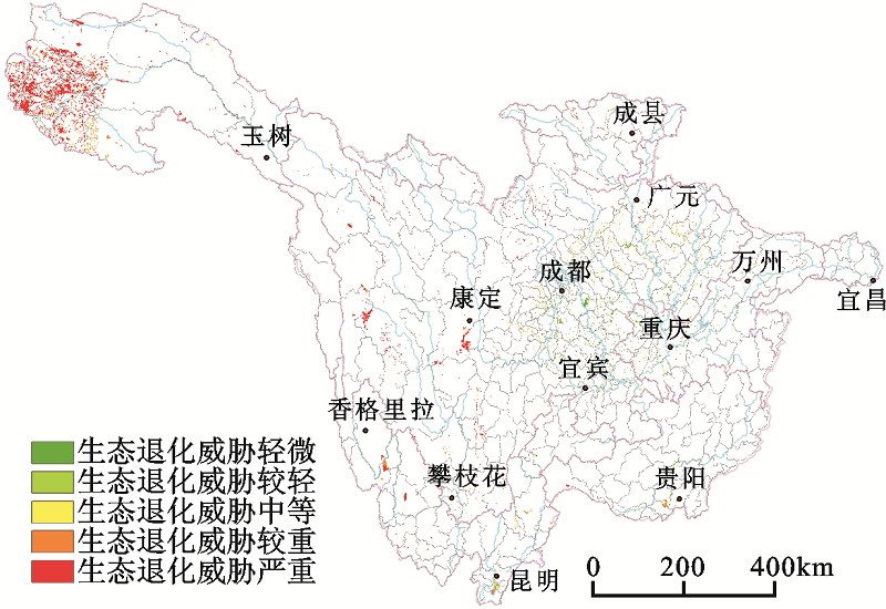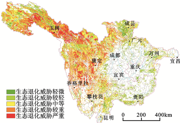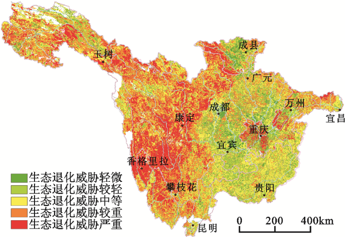 2) 长江上游生态系统退化威胁最严重的地区主要位于青海的格尔木市、治多、杂多县和玉树县,四川省的木里藏族自治县、康定、汶川、北川、雅江、马尔康县等,云南省的香格里拉和维西僳僳族自治县,甘肃省的迭部、文县和舟曲县,湖北省的神农架区、巫山、巴东、兴山和秭归县以及重庆市的垫江、梁平、大足、潼南等县。