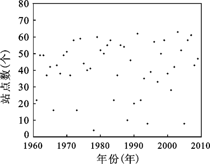 图2 江苏省1961~2009年梅雨期出现暴雨的站数散点图