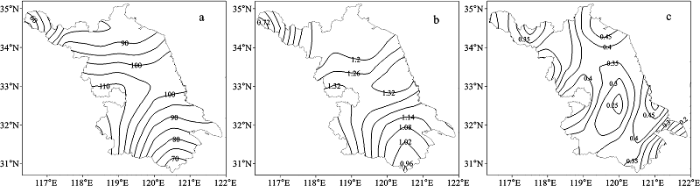 图1 江苏1961~2009年梅雨期暴雨的气候特征(a暴雨量(mm); b暴雨日(d); c暴雨比)