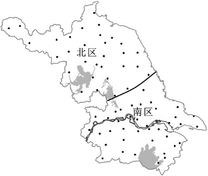 由上述分析可知,江苏梅雨期暴雨存在比较明显的南北差异。为了较准确划分南北区域的范围,本文应用SPSS软件[14], 采用组内连接(组间距离测度标准采用Pearson correlation系数),对江苏省66站1961~2009年梅雨期暴雨量场进行分区。分层聚类的分区(组) 结果最多有66 种,分别统计从66个区(组)连续分层聚类到1个区(组)的情况,连续计算每一种分区方案的组(区)内和组(区)间的平均相关系数,将组内和组间的平均相关系数之差值(Δr)作为衡量分区效果好坏的指标,结合站点的地理位置,依此来确定“最佳”分区方案。最终,江苏66 站1961~2009年梅雨期暴雨的“最佳”分区可定为2个,即分别为南区(35站)、北区(31站),如图3。