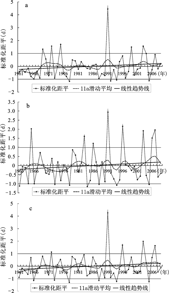图4 江苏南(a)北(b)区和江苏省(c)梅雨期暴雨的标准化距平,11 a滑动平均曲线和线性趋势线