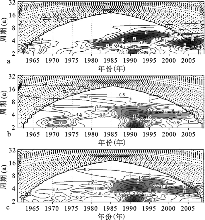 Fig.5 Wavelet coefficients of standardized anomaly precipitation of the south partition (a), the north partition (b), and the whole Jiangsu Province. (Wavelet coefficients of shaded area are more than 2.5)