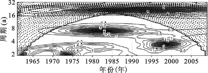 图7 1961~2009年南京站6~7月平均水位的小波系数(阴影区大于2.5)