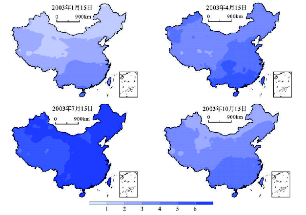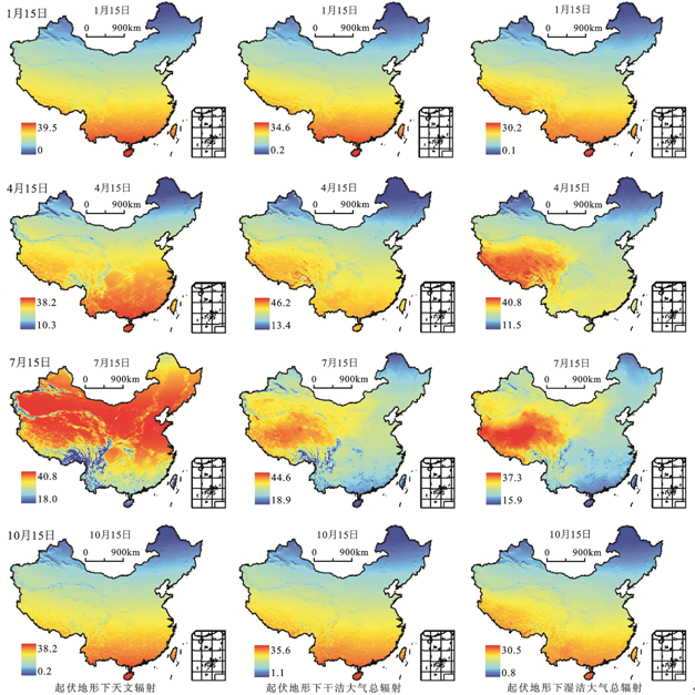 本文以1 km×1 km分辨率的DEM数据作为地形的综合反映,依据Iqbal Model C和起伏地形下干/湿洁大气总辐射模型,结合常规气象资料,实现了中国1 km×1 km分辨率水平面与起伏地形下干/湿洁大气日总辐射量空间分布的模拟,并对天文辐射量、干洁大气总辐射量、湿洁大气总辐射量3种起始数据进行了对比分析,主要结论为: