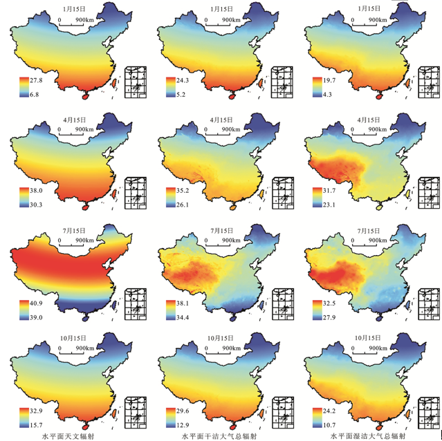 图1中同一横排表征同一日期,同一竖列表征同一种辐射量。从图1可以看出水平面天文辐射量具有明显的纬向变化特征,水平面干/湿洁大气总辐射总体上依然遵循随纬度变化的宏观分布规律,但在海拔高程明显的区域这种规律被打破,特别是在青藏高原及其周边地区,海拔高程影响在7月15日表现的尤为突出,4月15日次之,1月15日和10月15日不明显,即:海拔高程影响在夏半年要大于冬半年,而在影响的表现上,湿洁大气又较干洁大气更明显。